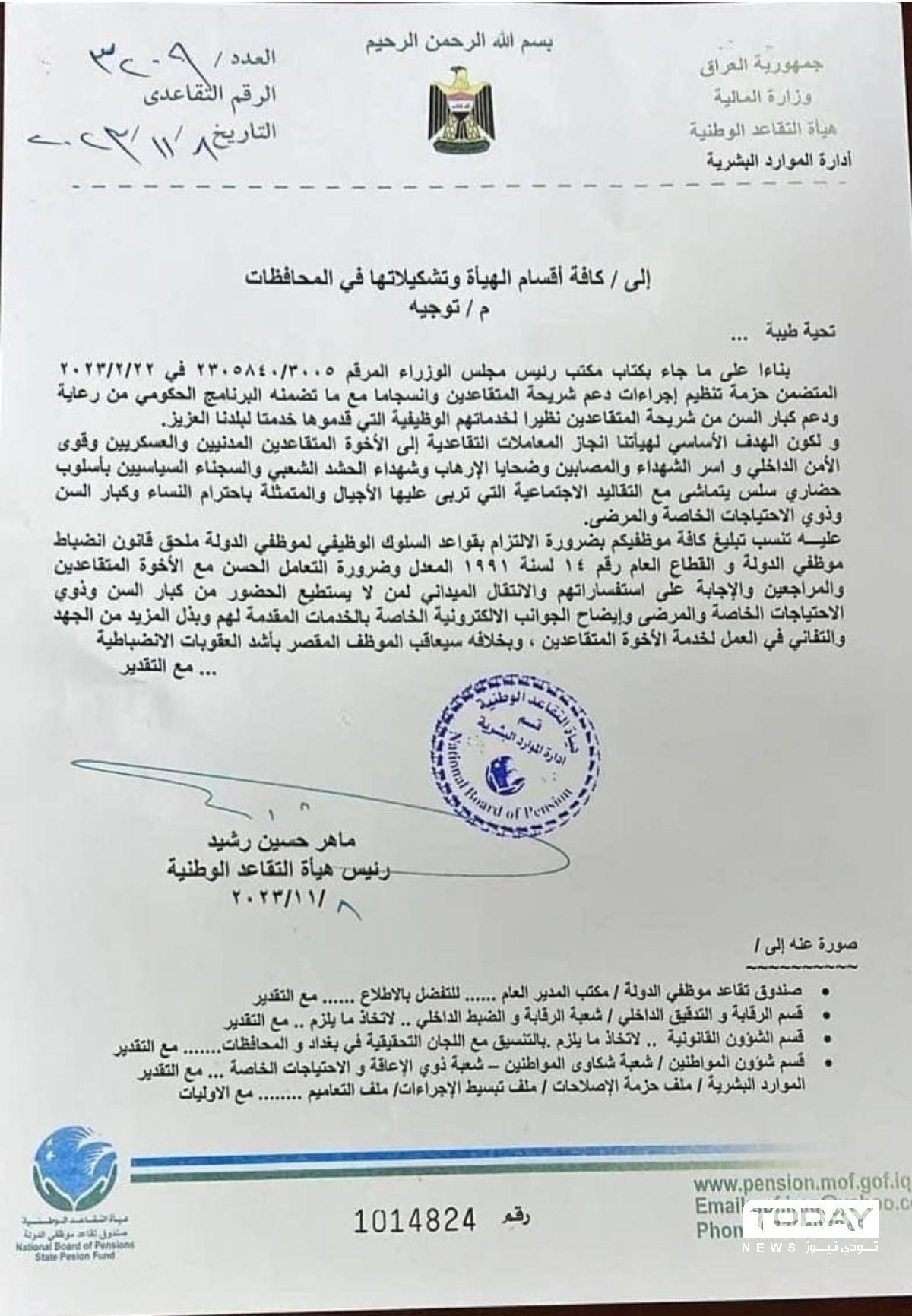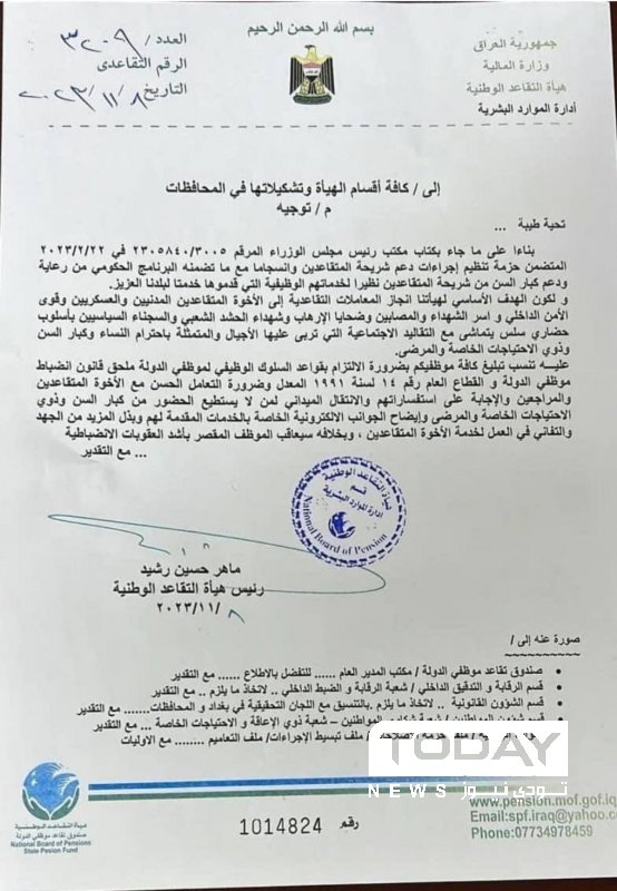 اصدرت هيئة التقاعد الوطنية، إعماما الى تشكيلاتها كافة بشأن الالتزام بقواعد السلوك الوظيفي لموظفي الدولة وضرورة التعامل الحسن مع المتقاعدين والمراجعين لتسهيل اجراءات معاملاتهم.
