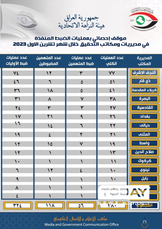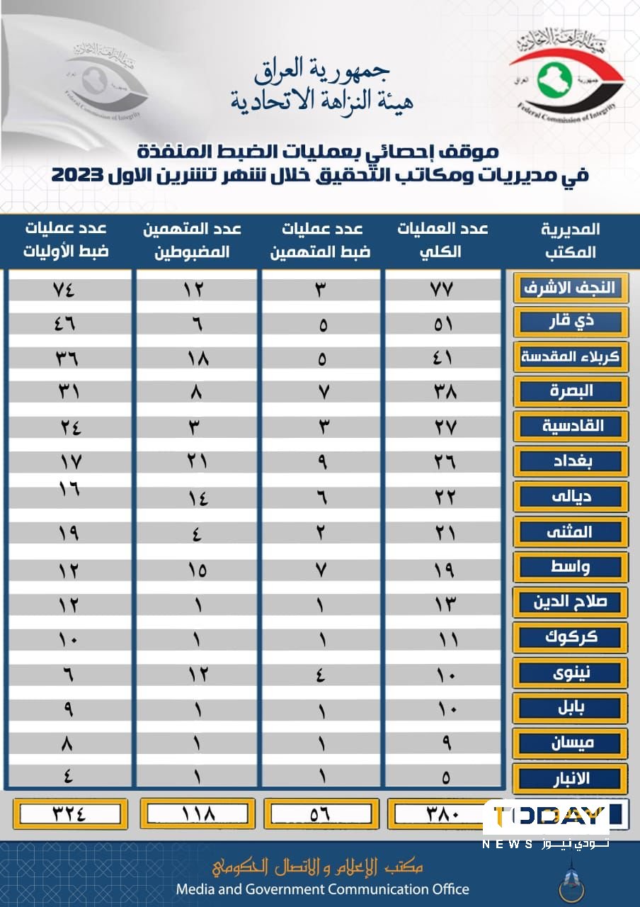 النزاهة تنفذ ٣٨٠ عملية ضبط خلال الشهر الماضي