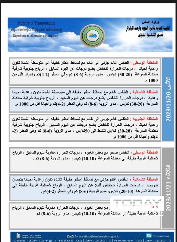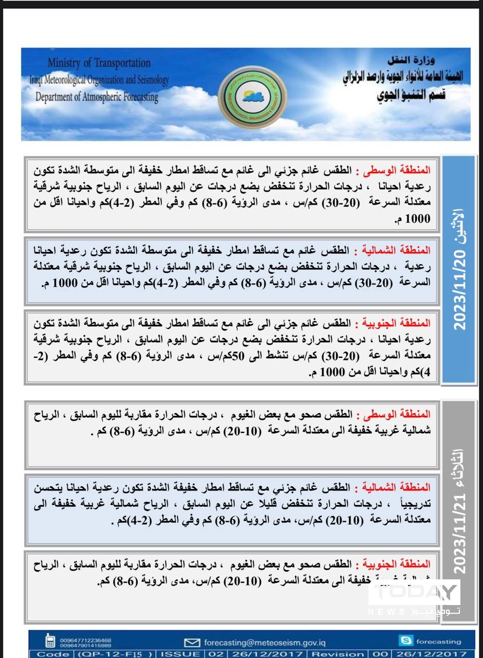 كشفت هيئة الأنواء الجوية، عن طقس البلاد خلال الأيام المقبلة، فيما توقعت عن تشكل ضباب خلال ساعات الصباح الأولى مع وجود فرص لهطول أمطار على أغلب مدن البلاد.