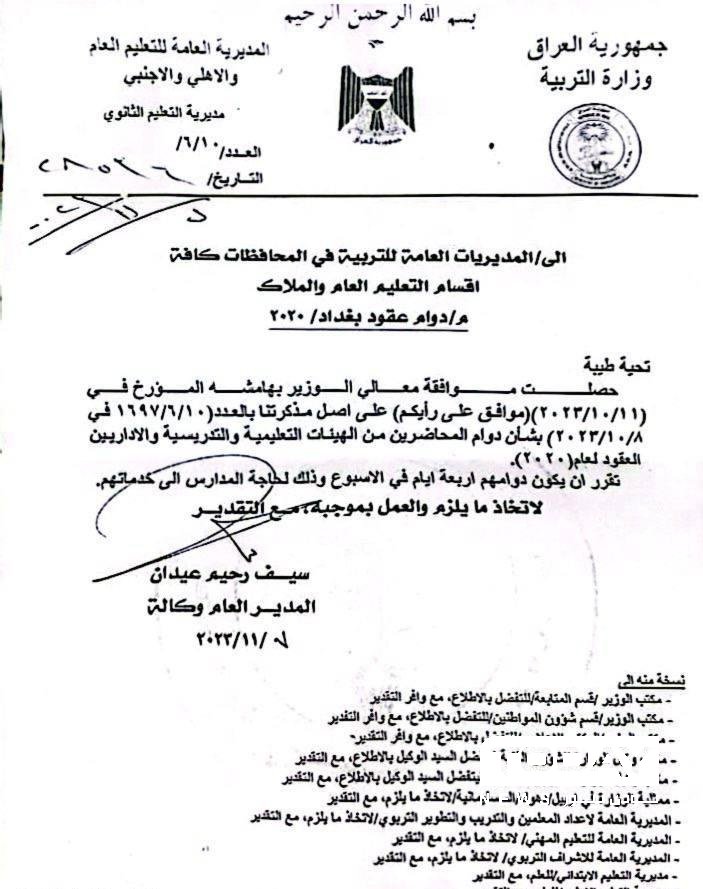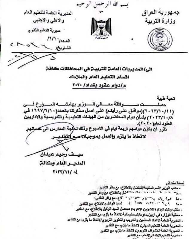 وثيقة : التربية توافق على دوام المحاضرين والاداريين لأربعة أيام أسبوعياً