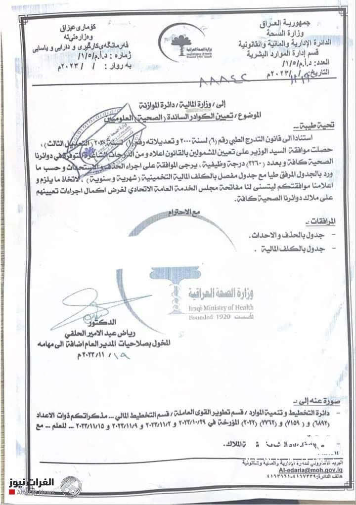 اعلنت وزارة الصحة، اليوم الاثنين، موافقة الوزير على تعيين 3260 خريج من الكوادر الصحية على ملاك الوزارة .