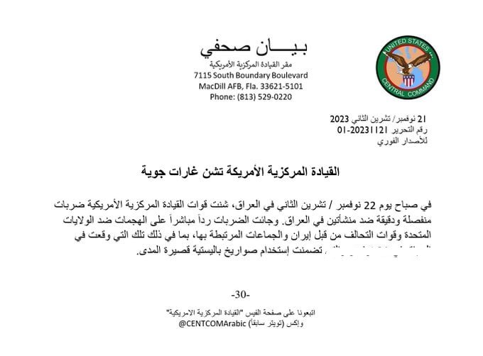 أعلنت القيادة الأمريكية، اليوم الأربعاء، 22 تشرين الثاني، 2023، شنت ضربات منفصلة ودقيقة ضد منشأتين في العراق.