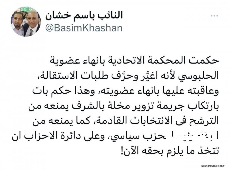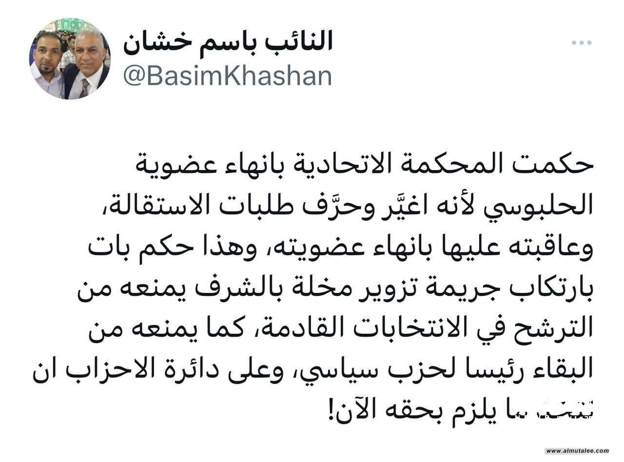 و قال عضو اللجنة باسم خشان في تغريدة له إن "المحكمة الاتحادية حكمت بإنهاء عضوية الحلبوسي لأنه اغيَّر وحرَّف طلبات الاستقالة، وعاقبته عليها بإنهاء عضويته".