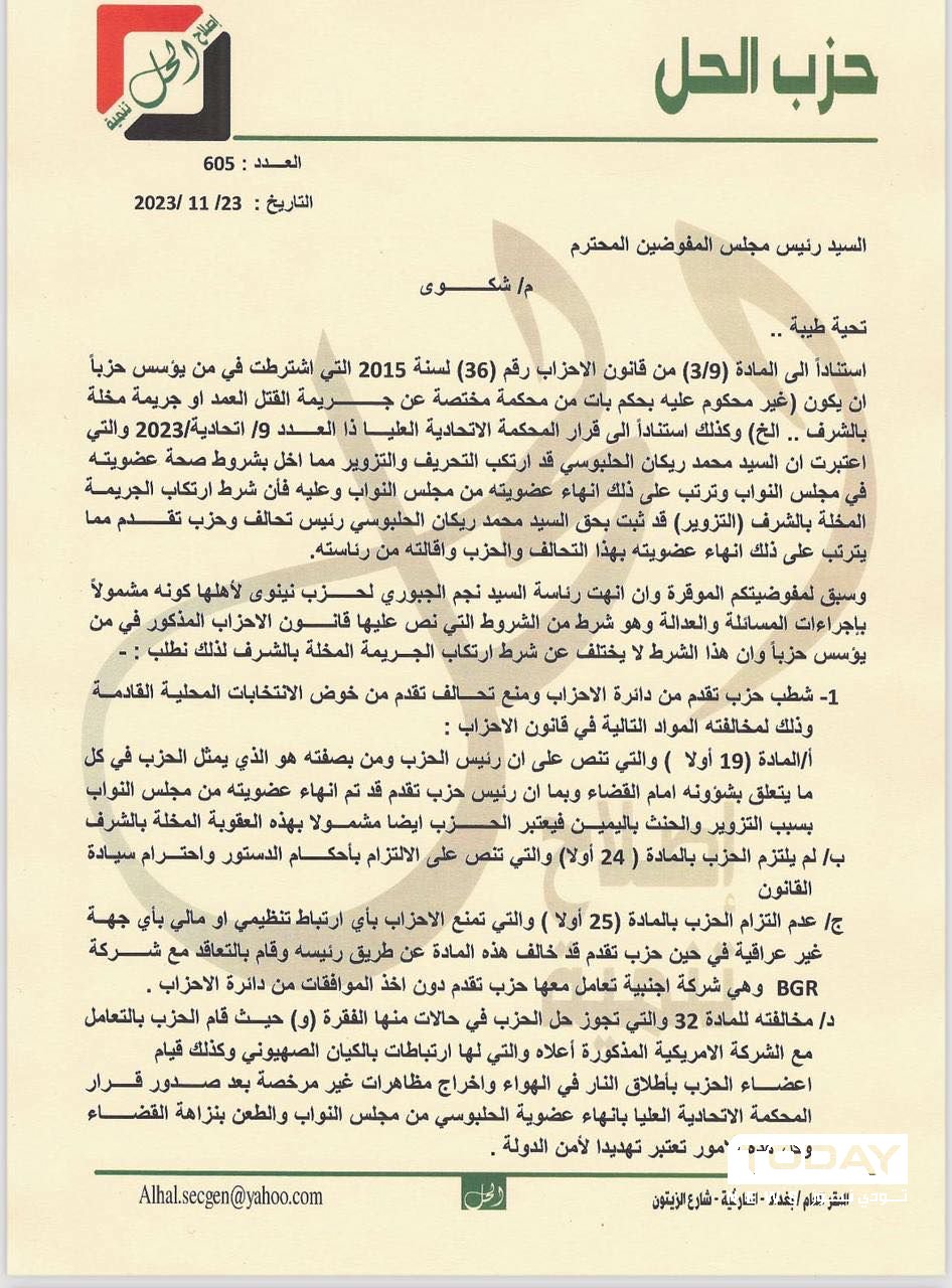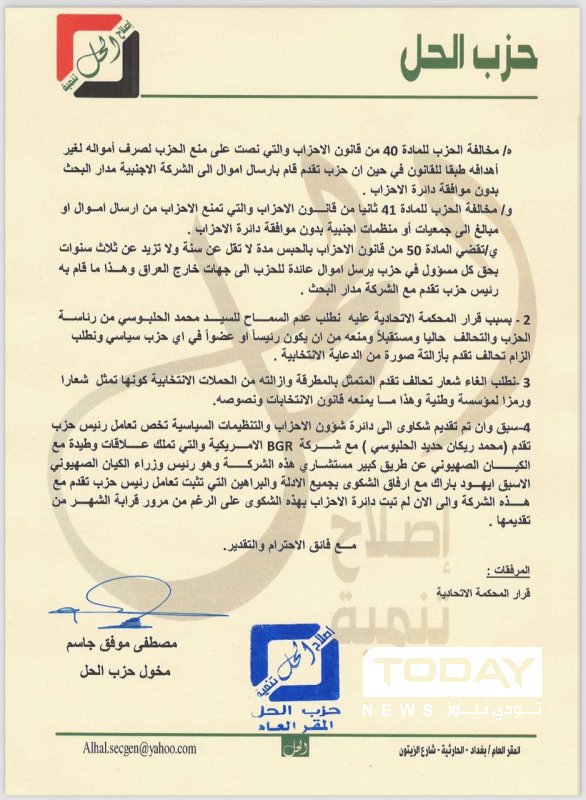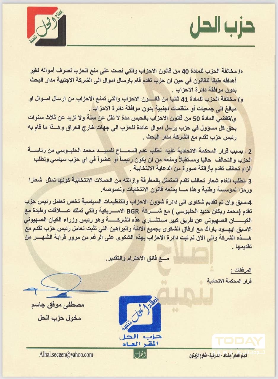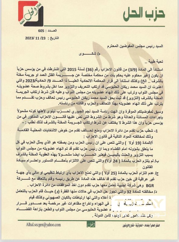 وثيقة : حزب الحل يطالب المفوضية بشطب تقدم ومنعه من خوض الانتخابات
