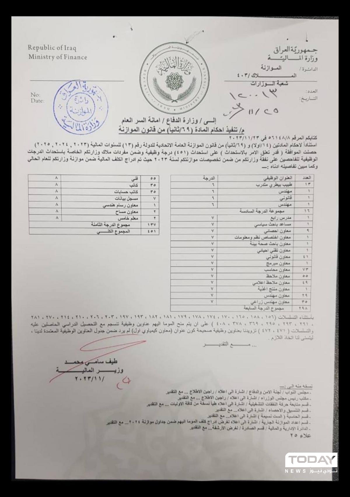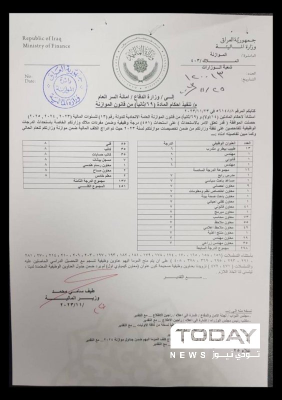 المالية توافق على استحداث الدرجات الوظيفية لفاحصي وزارة الدفاع (وثيقة)