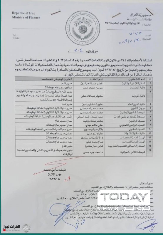 كلفت وزيرة المالية طيف سامي اليوم الخميس عدداً من الموظفين بادارة المناصب بالوكالة لحين حسم التصويت على المديرين العامين بالإصالة.