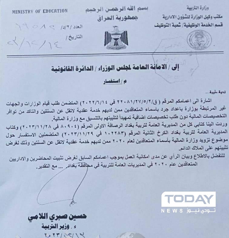 التربية توافق على تثبيت عقود بغداد 2020 في المديريات الست