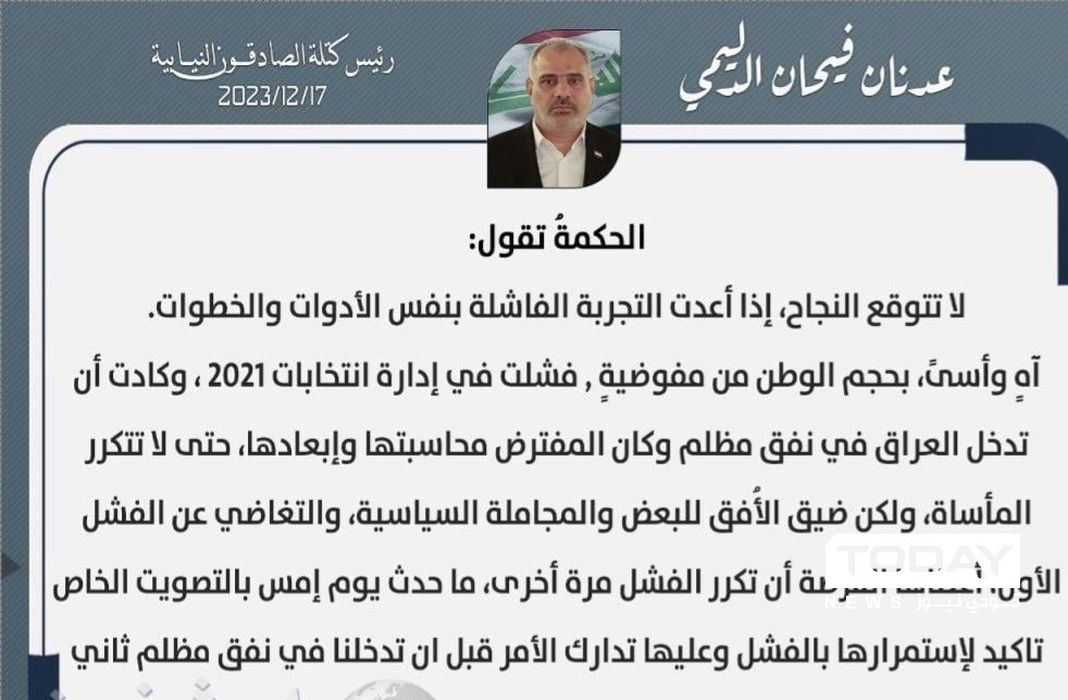 هاجم رئيس كتلة الصادقون التابعة لعصائب اهل الحق عدنان فيحان اليوم الأحد، المفوضية العليا للانتخابات، فيما دعاها إلى تدارك فشلها قبل أن تدخل البلاد في نفق مظلم.