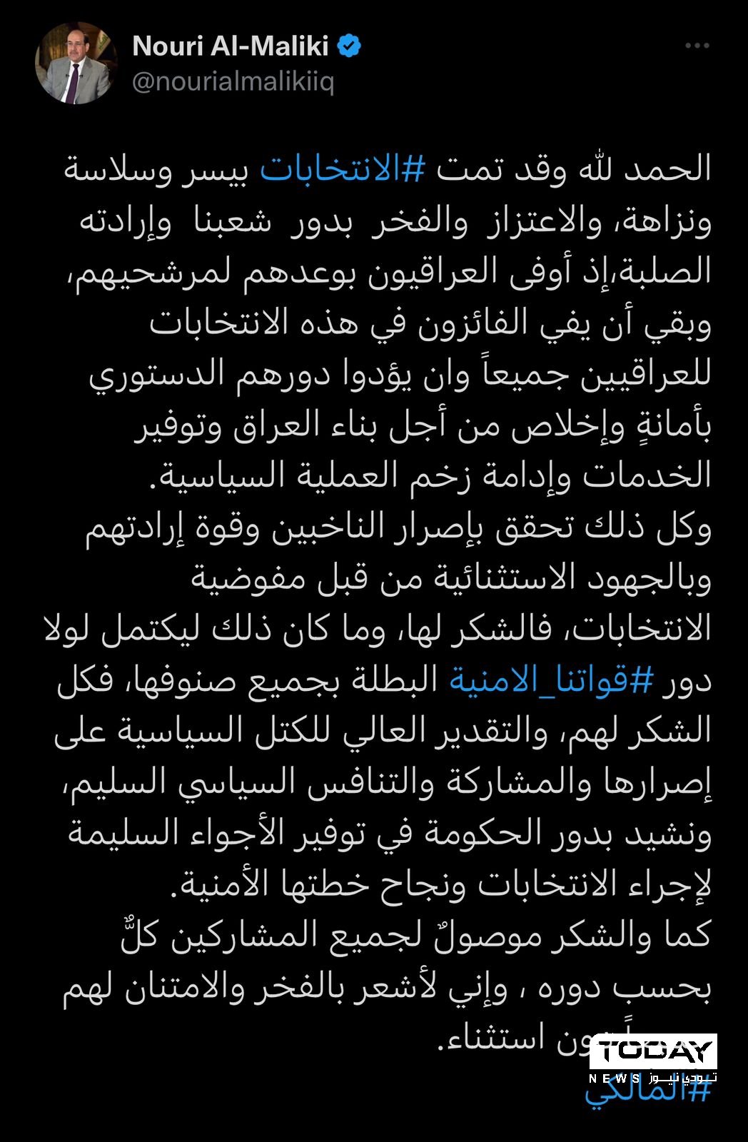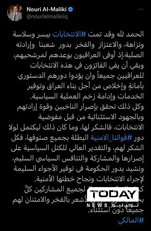 وقال المالكي في تغريدة له "الحمد لله وقد تمت الانتخابات بيسر وسلاسة ونزاهة، والاعتزاز والفخر بدور شعبنا وإرادته الصلبة، إذ أوفى العراقيون بوعدهم لمرشحيهم، وبقي أن يفي الفائزون في هذه الانتخابات للعراقيين جميعاً وان يؤدوا دورهم الدستوري بأمانةٍ وإخلاص من أجل بناء العراق وتوفير الخدمات وإدامة زخم العملية السياسية"