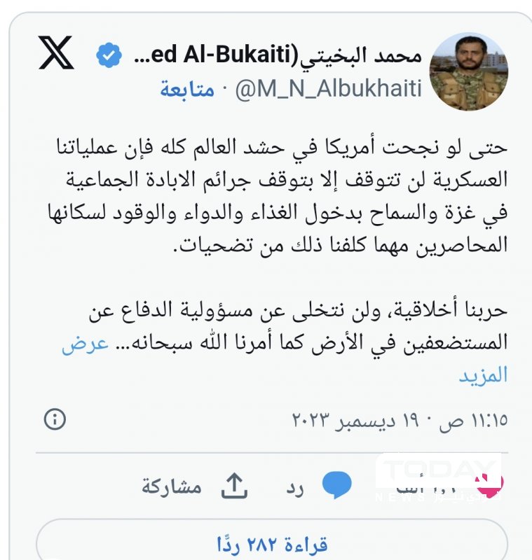 وقال البخيتي عبر منصة "إكس": "حتى لو نجحت أمريكا في حشد العالم كله فإن عملياتنا العسكرية لن تتوقف إلا بتوقف جرائم الإبادة الجماعية في غزة والسماح بدخول الغذاء والدواء والوقود لسكانها المحاصرين مهما كلفنا ذلك من تضحيات".