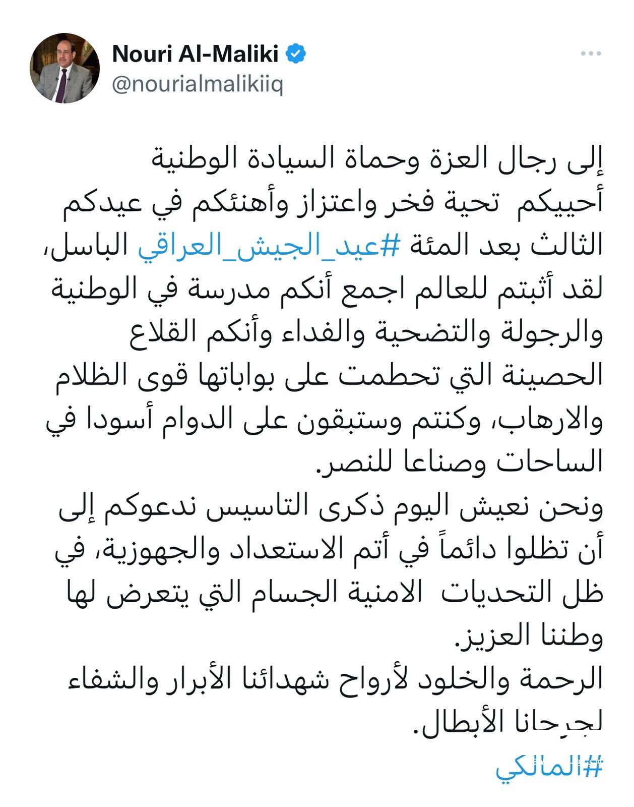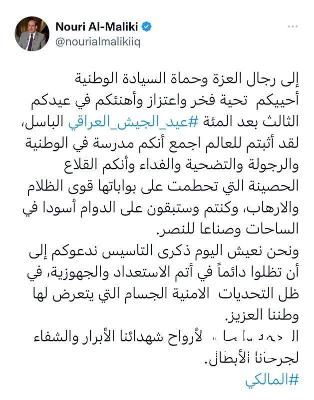 المالكي يهنئ الجيش العراقي في ذكرى تأسيسه