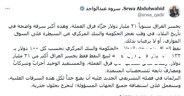 وكتبت رئيس كتلة الجيل الجديد النيابية، سروة عبدالواحد في تغريدة على منصة إكس ، إن العراق يعاني من عجز في السيطرة على السوق الموازية، مما يجعل الحكومة والبنك المركزي عاجزين عن القضاء على هذه الخسائر أو عدم الرغبة في ذلك.