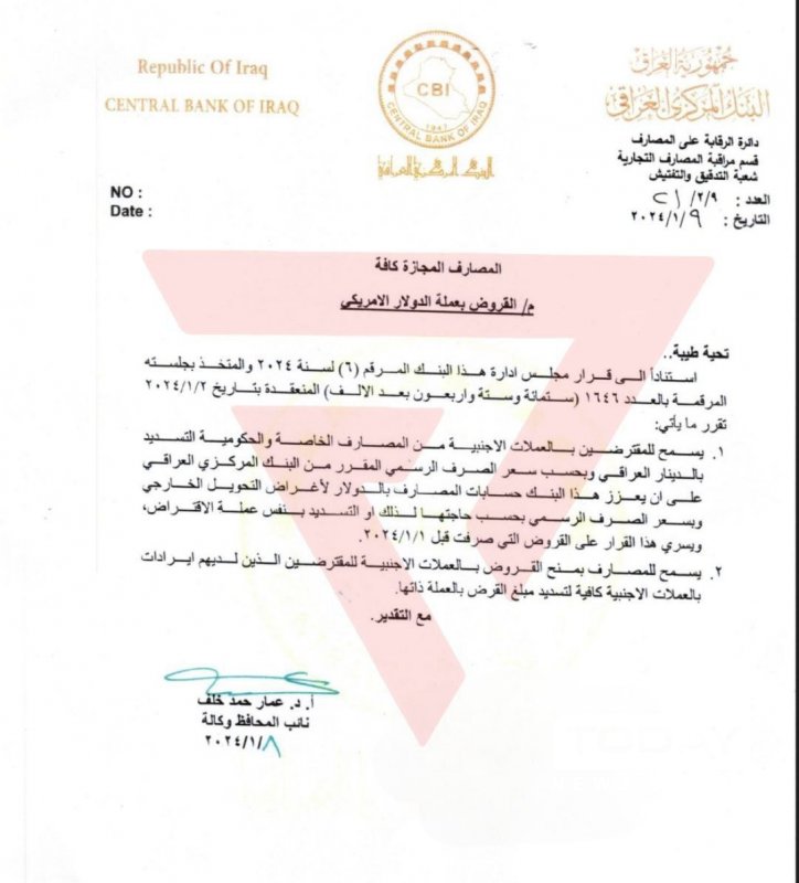 ويشمل هذا الإجراء القرار بالتسديد بسعر الصرف الرسمي الذي يحدده البنك المركزي العراقي، ويبدأ سريان هذا الإجراء اعتبارا من 1 يناير 2024.