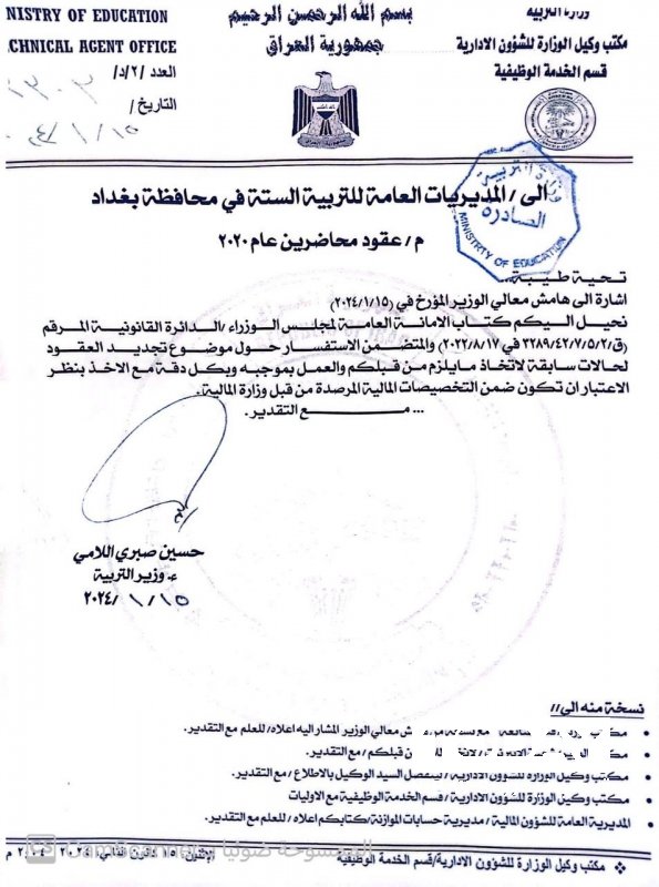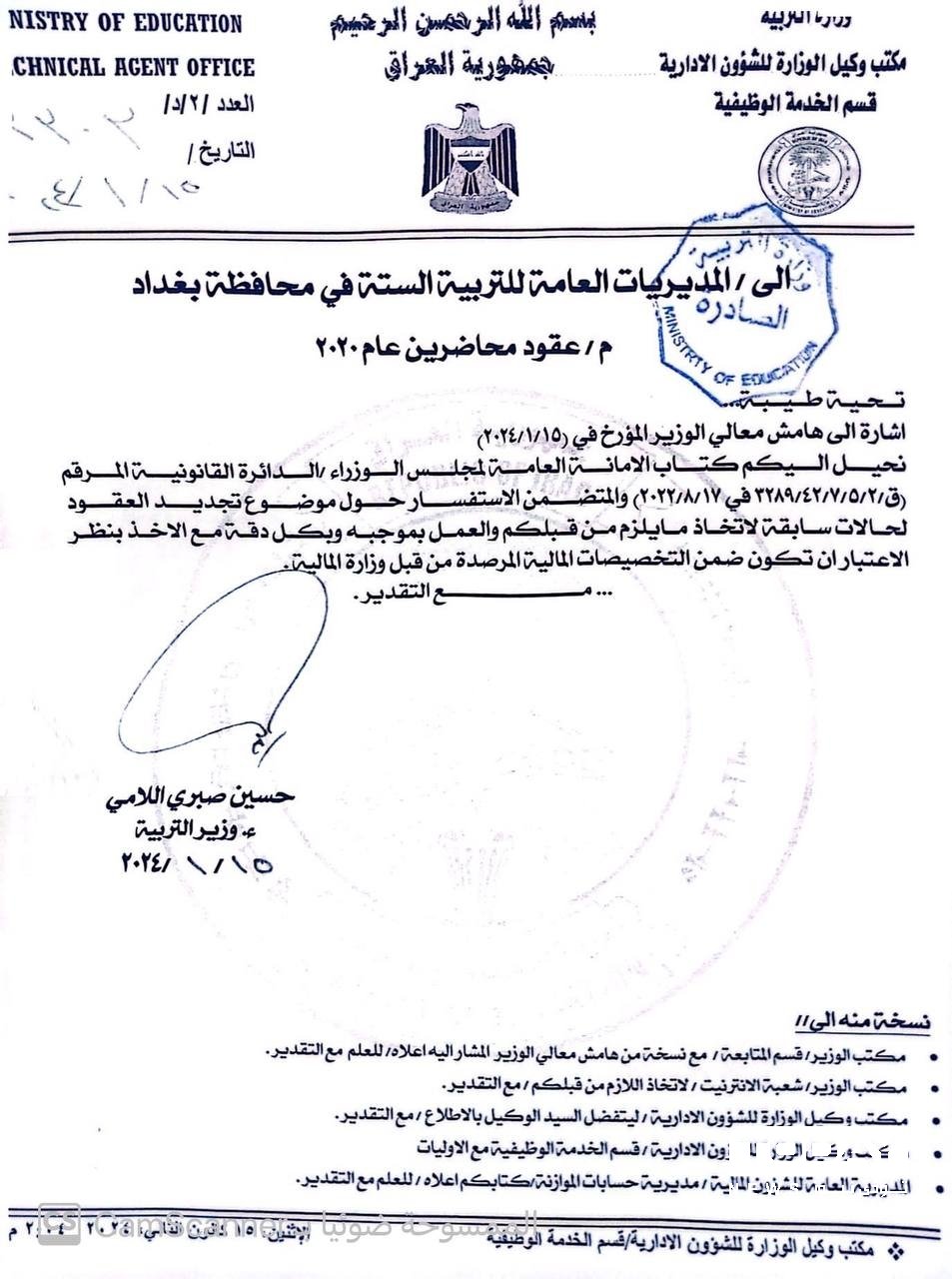 وثيقة.. التربية تخاطب مديريات بغداد لصرف رواتب وتجديد العقود لمحاضري