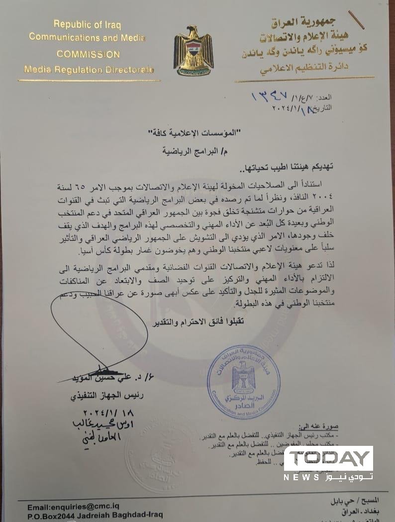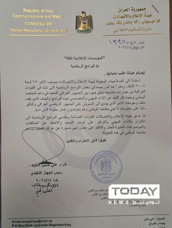 وبحسب وثيقة صادرة من الهيئة ، فأنه “استناداً الى الصلاحيات المخولة لهيئة الإعلام والاتصالات، ونظراً لما تم رصده في بعض البرامج الرياضية التي تبث في القنوات العراقية من حوارات متشنجة تخلق فجوة بين الجمهور العراقي المتحد في دعم المنتخب الوطني وبعيدة كل البعد عن الأداء المهني والتخصصي لهذه البرامج والهدف الذي يقف خلف وجودها، الأمر الذي يؤدي الى التشويش على الجمهور الرياضي العراقي والتأثير سلباً على معنويات لاعبي منتخبنا الوطني وهم يخوضون عمار بطولة كأس آسيا”.