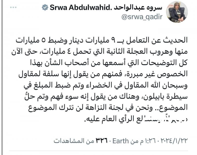 النزاهة النيابية : ضبط 9 مليارات دينار في عجلة مجهولة بالمنطقة الخضراء