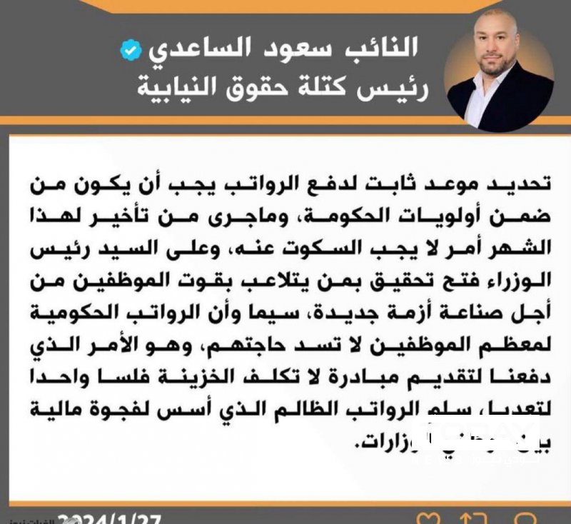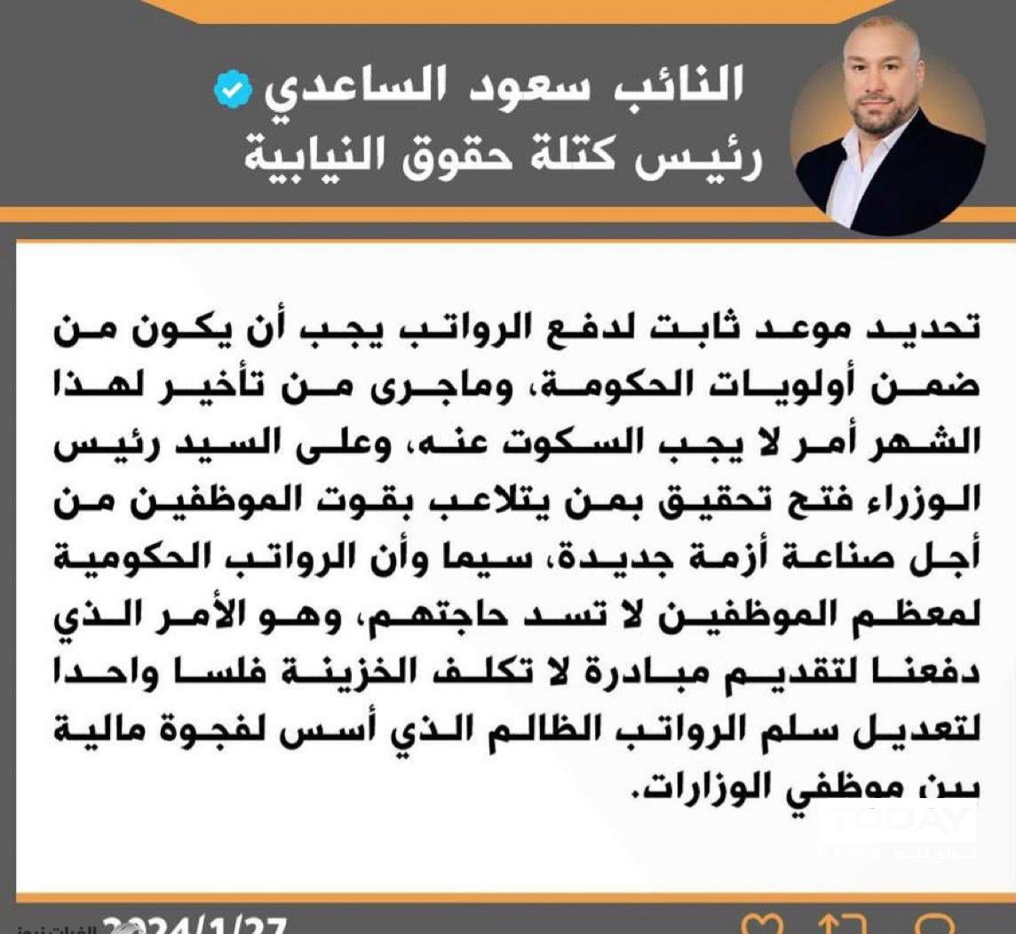 كتلة برلمانية تطالب السوداني بالتحقيق في تأخر رواتب الموظفين