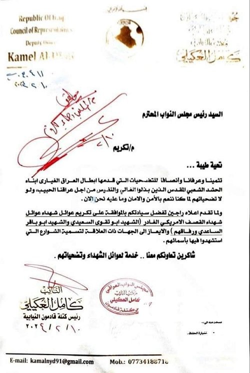 المندلاوي يوافق على تسمية شوارع في بغداد باسماء "ابو تقى السعيدي وابو باقر الساعدي"