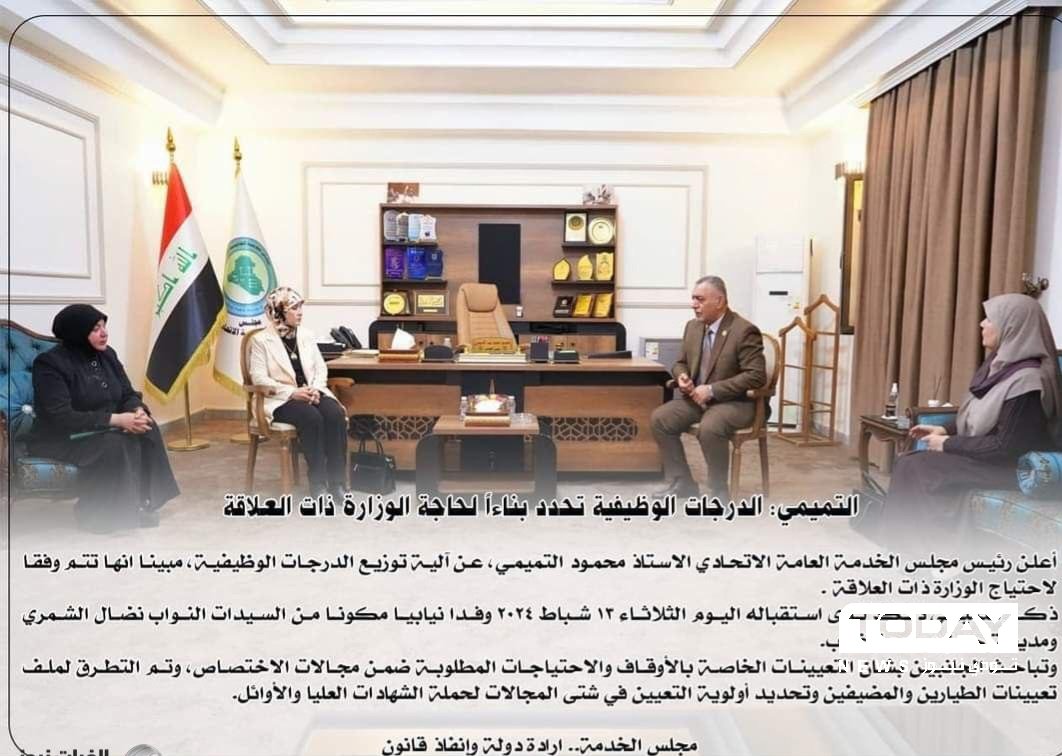 اعلن رئيس مجلس الخدمة العامة الاتحادي محمود التميمي، اليوم الثلاثاء، عن آلية توزيع الدرجات الوظيفية، فيما اكد انها تتم وفق اختيار الوزارة المعنية.