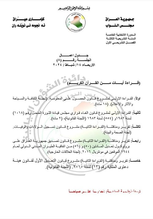 جدول أعمال جلسة البرلمان ليوم غد الأربعاء
