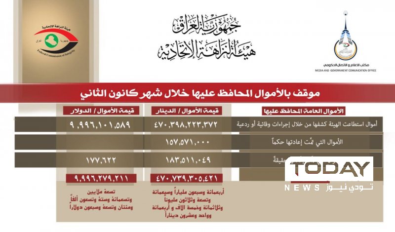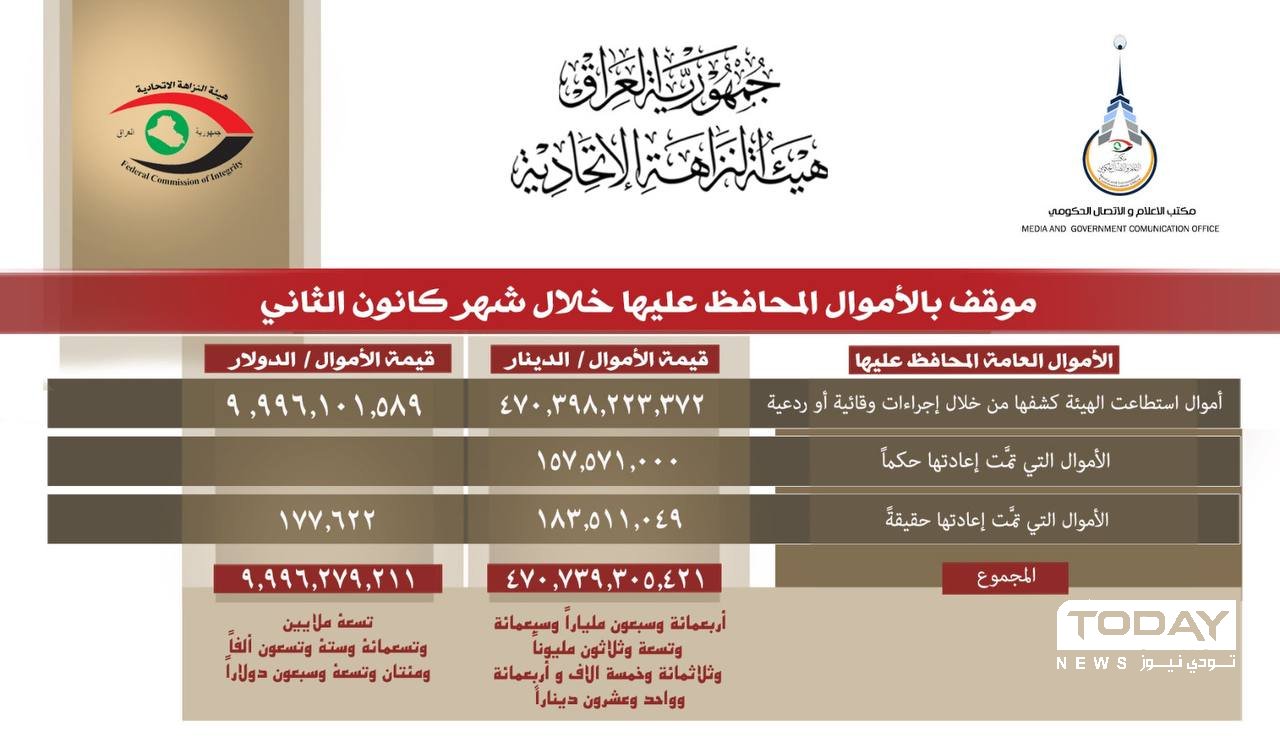 النزاهة تعلن استرداد اكثر من 9 ملايين دولار خلال الشهر الماضي