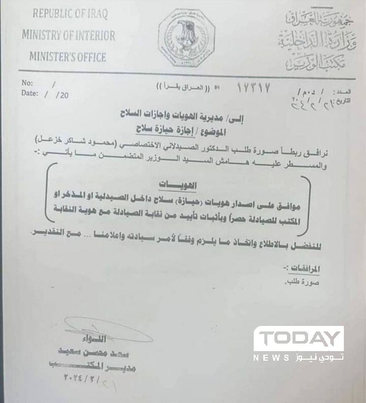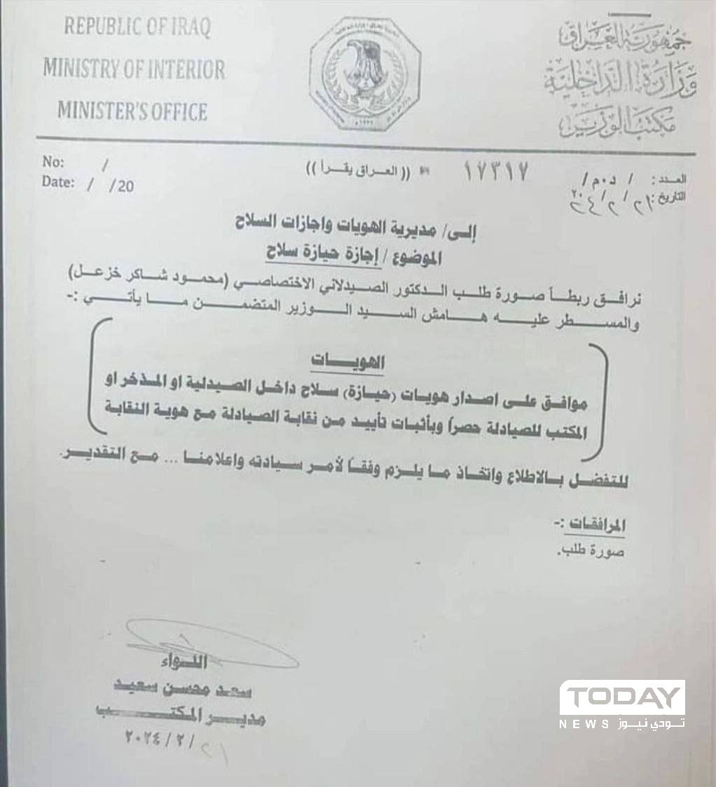 وجاء في كتاب صادر عن مدير مكتب وزير الداخلية، وتلقته TodayNews ، ومعنون الى مديرية الهويات وإجازات السلاح في الوزارة، "الموافقة على اصدار هويات حيازة سلاح داخل الصيدلية او المذخر او المكتب للصيادلة حصرا، بإثبات تأييد من نقابة الصيادلة مع هوية النقابة".