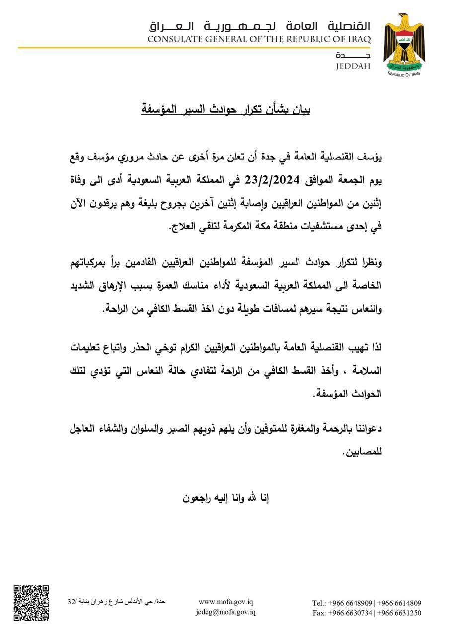 القنصلية ذكرت في بيان لها "يؤسف القنصلية العامة في جدة أن تعلن مرة أخرى عن حادث مروري مؤسف وقع يوم الجمعة الموافق 23/2/2024 في المملكة العربية السعودية أدى الى وفاة إثنين من المواطنين العراقيين وإصابة اثنين آخرين بجروح بليغة وهم يرقدون الآن في إحدى مستشفيات منطقة مكة المكرمة لتلقي العلاج".