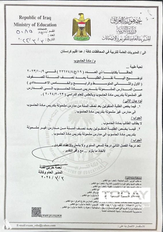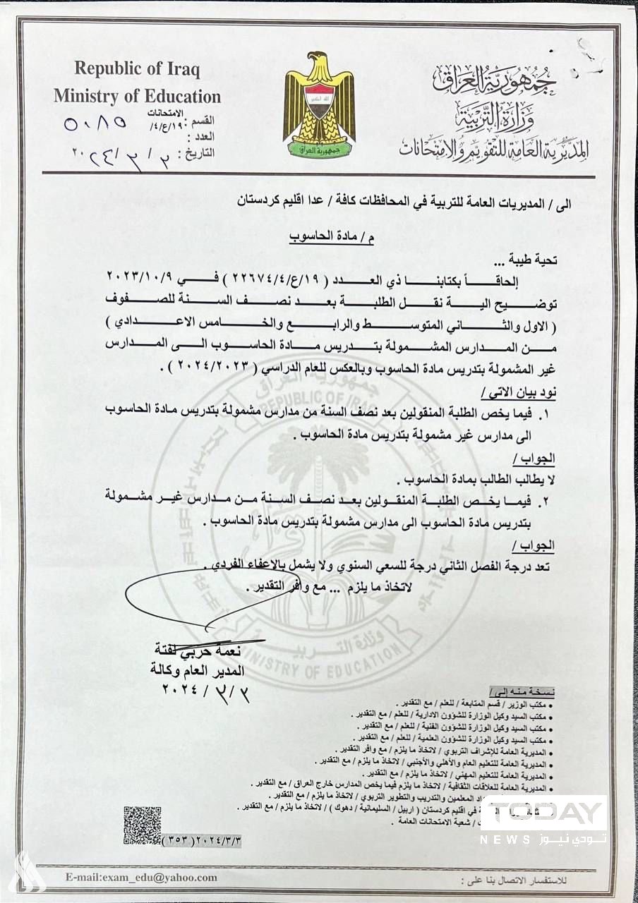 وذكر بيان للوزارة، تلقت TodayNews نسخة منه، أن"المديرية العامة للتقويم والامتحانات،أوضحت اليوم آلية نقل الطلبة بعد نصف السنة للصفوف( الأول والثاني المتوسط والرابع والخامس الإعدادي) من المدارس المشمولة بتدريس مادة الحاسوب الى المدارس غير المشمولة بتدريس المادة وبالعكس للعام الدراسي (2024/2023) ".