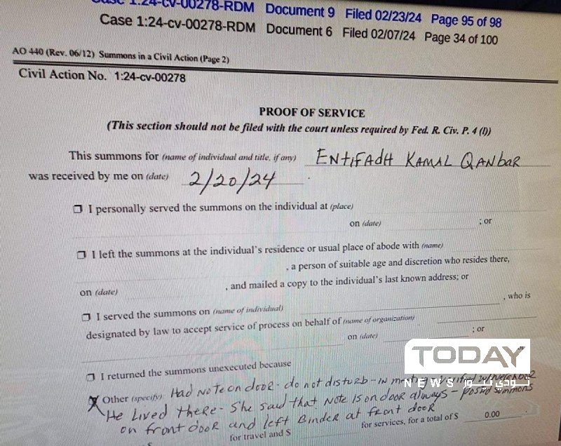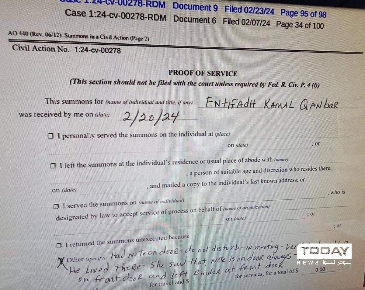 كشفت وثيقة أمريكية عن تبليغ رئيس مؤسسة المستقبل في واشنطن انتفاض قنبر بالمثول أمام محكمة أمريكية.
