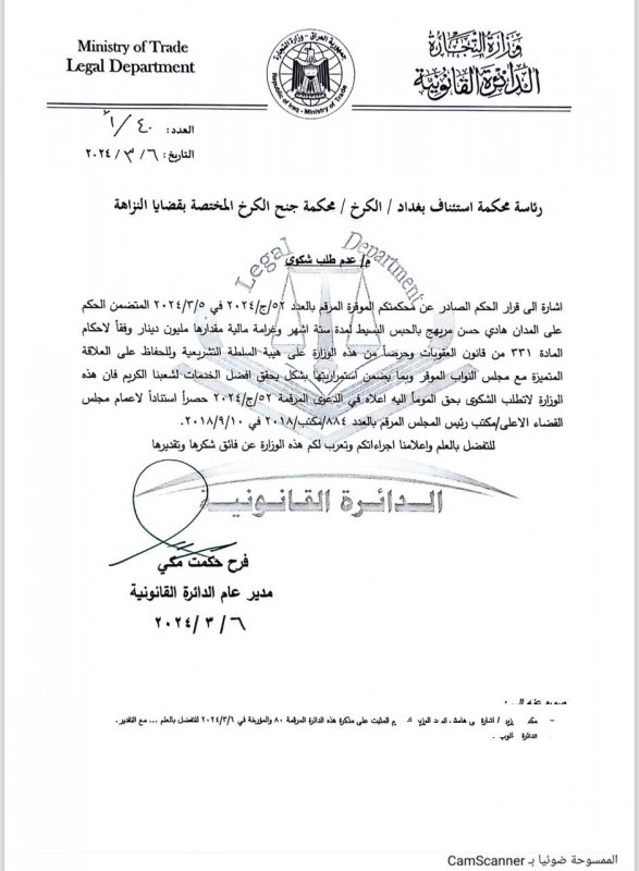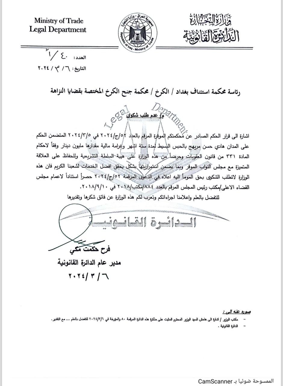 وثيقة.. التجارة تتنازل عن الشكوى المقدمة ضد النائب هادي السلامي