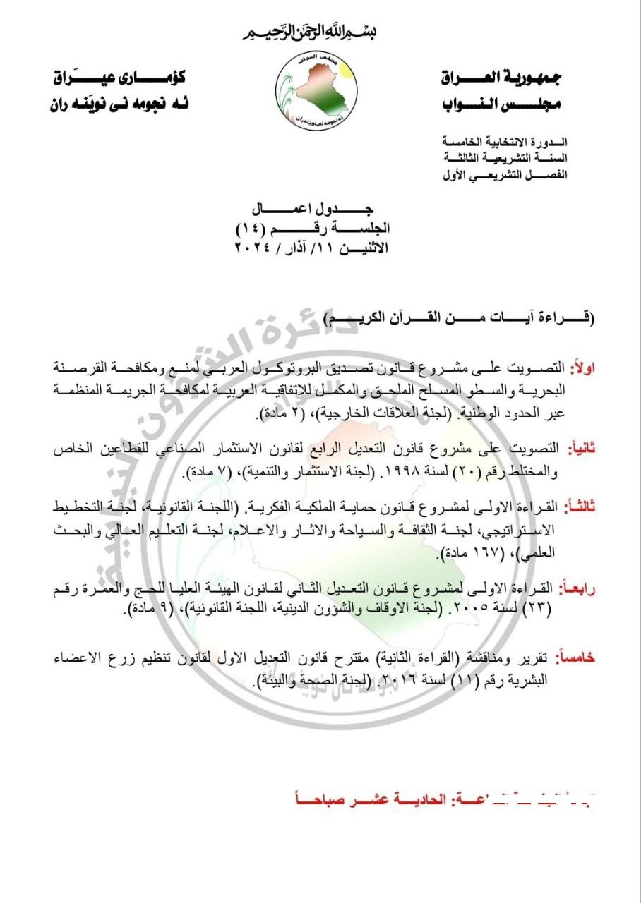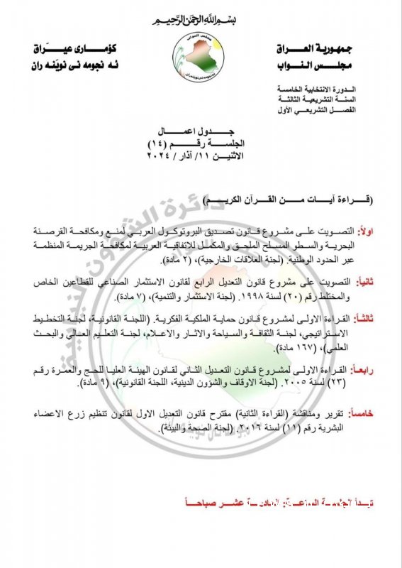 البرلمان ينشر جدول اعماله ليوم الإثنين المقبل