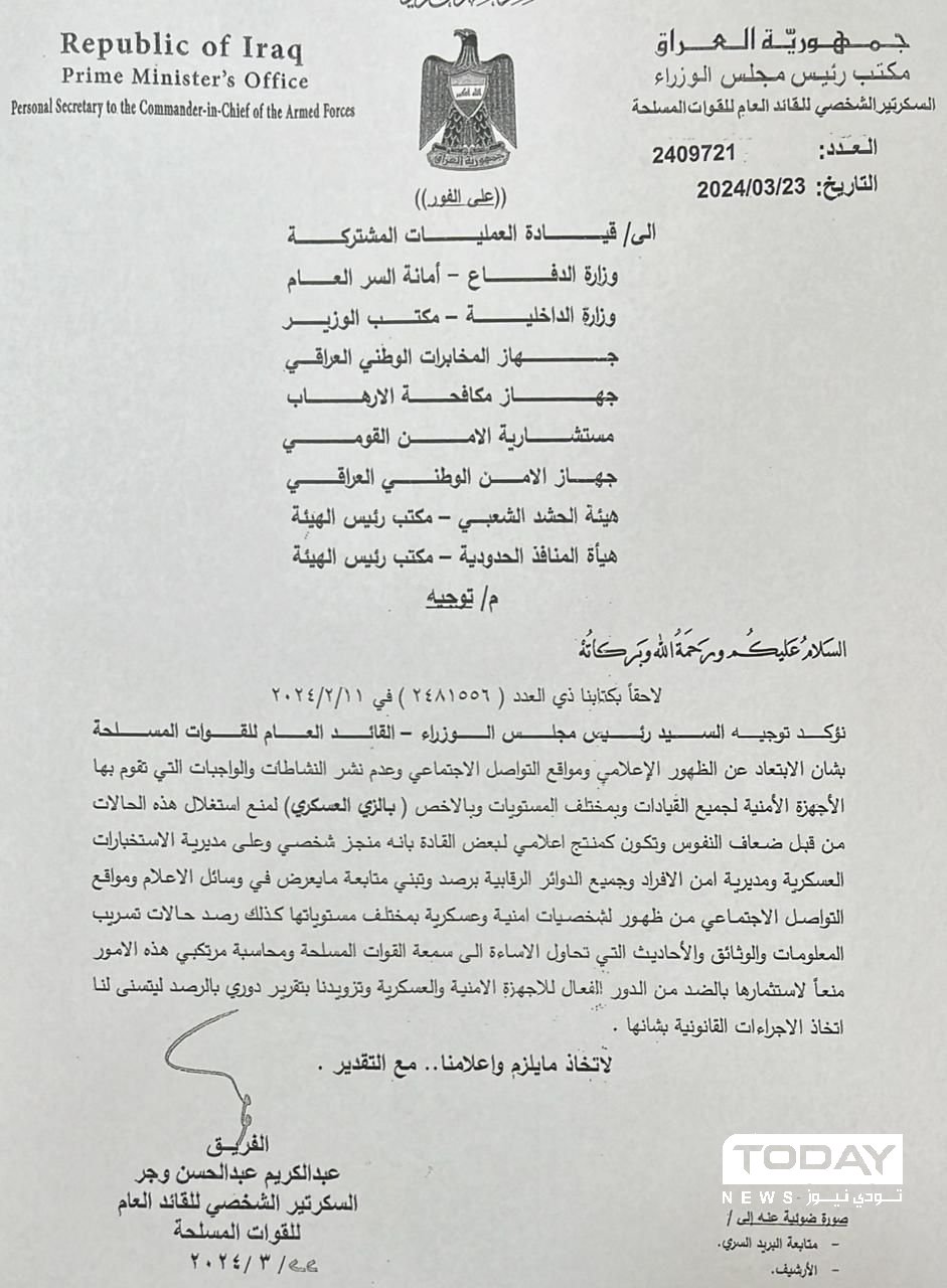 وجاء في وثيقة مذيلة بتوقيع السكرتير الشخصي للقائد العام للقوات المسلحة، ومعنونة الى الجهات العسكرية والأمنية ، "نؤكد توجيه رئيس مجلس الوزراء - القائد العام للقوات المسلحة بشأن الابتعاد عن الظهور الإعلامي ومواقع التواصل الاجتماعي وعدم نشر النشاطات والواجبات التي تقوم بها الأجهزة الأمنية لجميع القيادات وبمختلف المستويات وبالاخص ) بالزي العسكري)".