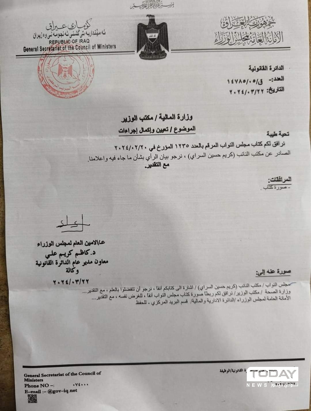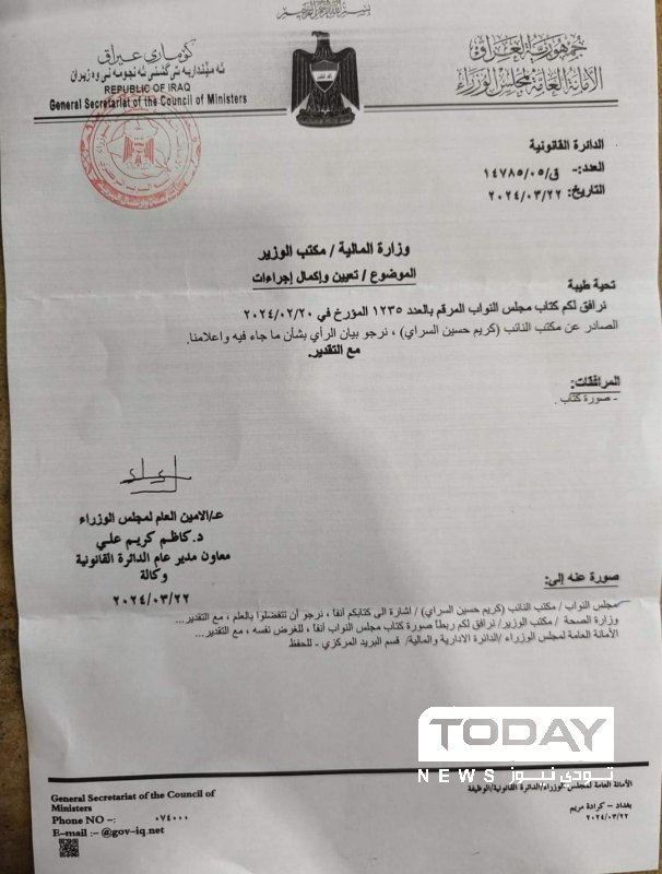 وبحسب وثيقة صادرة من الامانة العامة ، فأن "الامانة خاطبت وزارة المالية حول امكانية تعيين ذوي المتوفين في جائحة كـورونا ضمن ملاك وزارة الصحة اكرامآ لتضحياتهم الكبيرة".