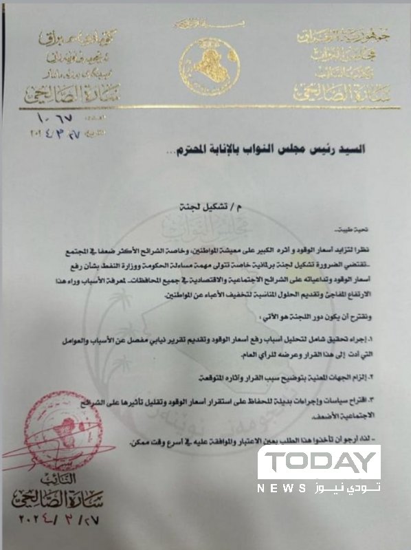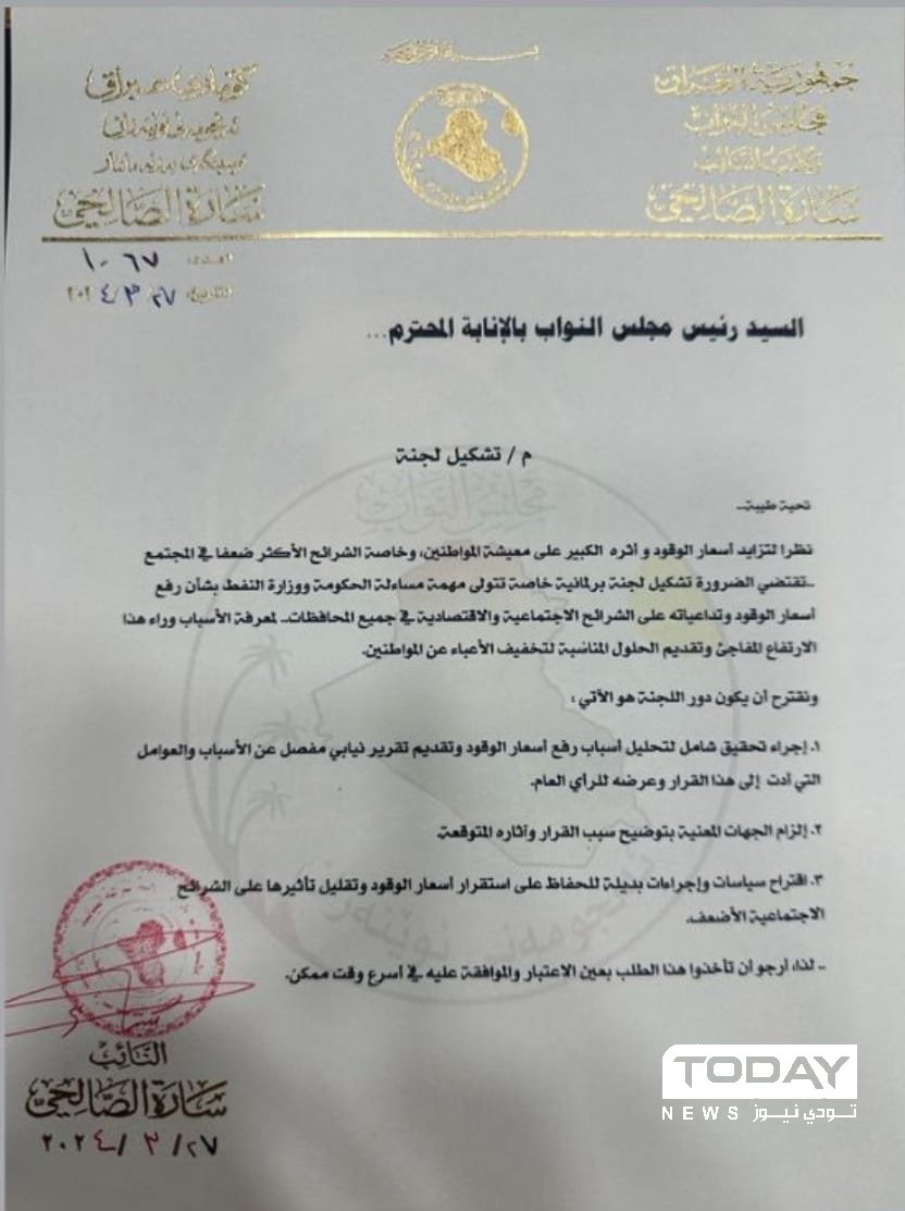 وجاء في كتاب وجهته الصالحي الى المندلاوي ، "نظرا لتزايد أسعار الوقود وأثره الكبير على معيشة المواطنين، وخاصة الشرائح الأكثر ضعفا في المجتمع تقتضي الضرورة تشكيل لجنة برلمانية خاصة تتولى مهمة مساءلة الحكومة ووزارة النفط بشأن رفع أسعار الوقود وتداعياته على الشرائح الاجتماعية والاقتصادية في جميع المحافظات لمعرفة الأسباب وراء هذا الارتفاع المفاجئ وتقديم الحلول المناسبة لتخفيف الأعباء عن المواطنين".