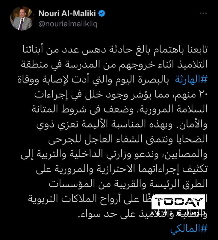 وقال المالكي في تدوينة له ، "تابعنا باهتمام بالغ حادثة دهس عدد من أبنائنا التلاميذ اثناء خروجهم من المدرسة في منطقة الهارثة بالبصرة اليوم والتي أدت لإصابة ووفاة ٢٠ منهم، مما يؤشر وجود خلل في إجراءات السلامة المرورية، وضعف في شروط المتانة والأمان".