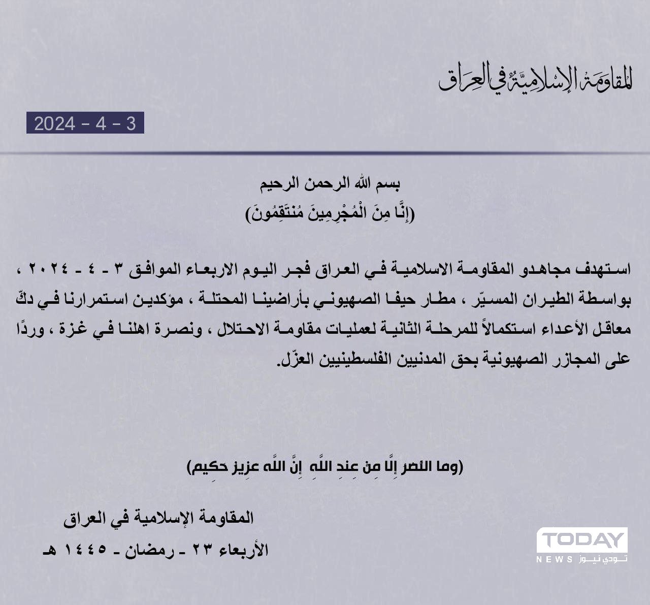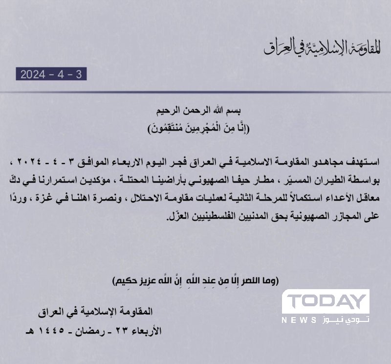 المقاومة في العراق تعلن استهداف مطار حيفا الاسرائيلي