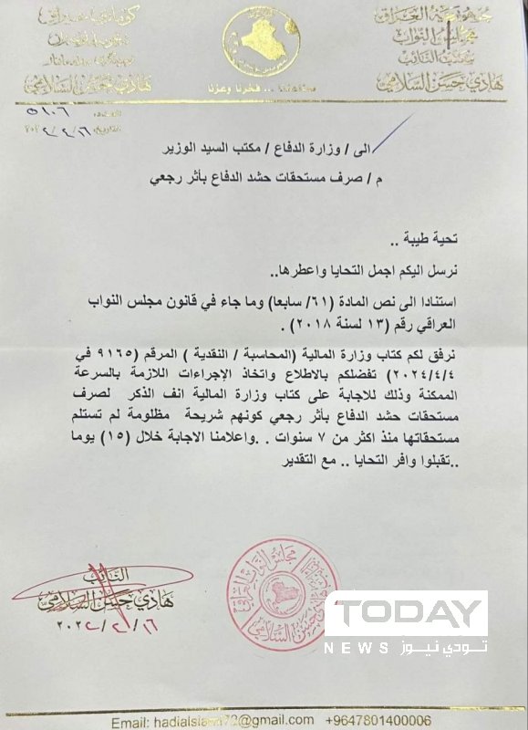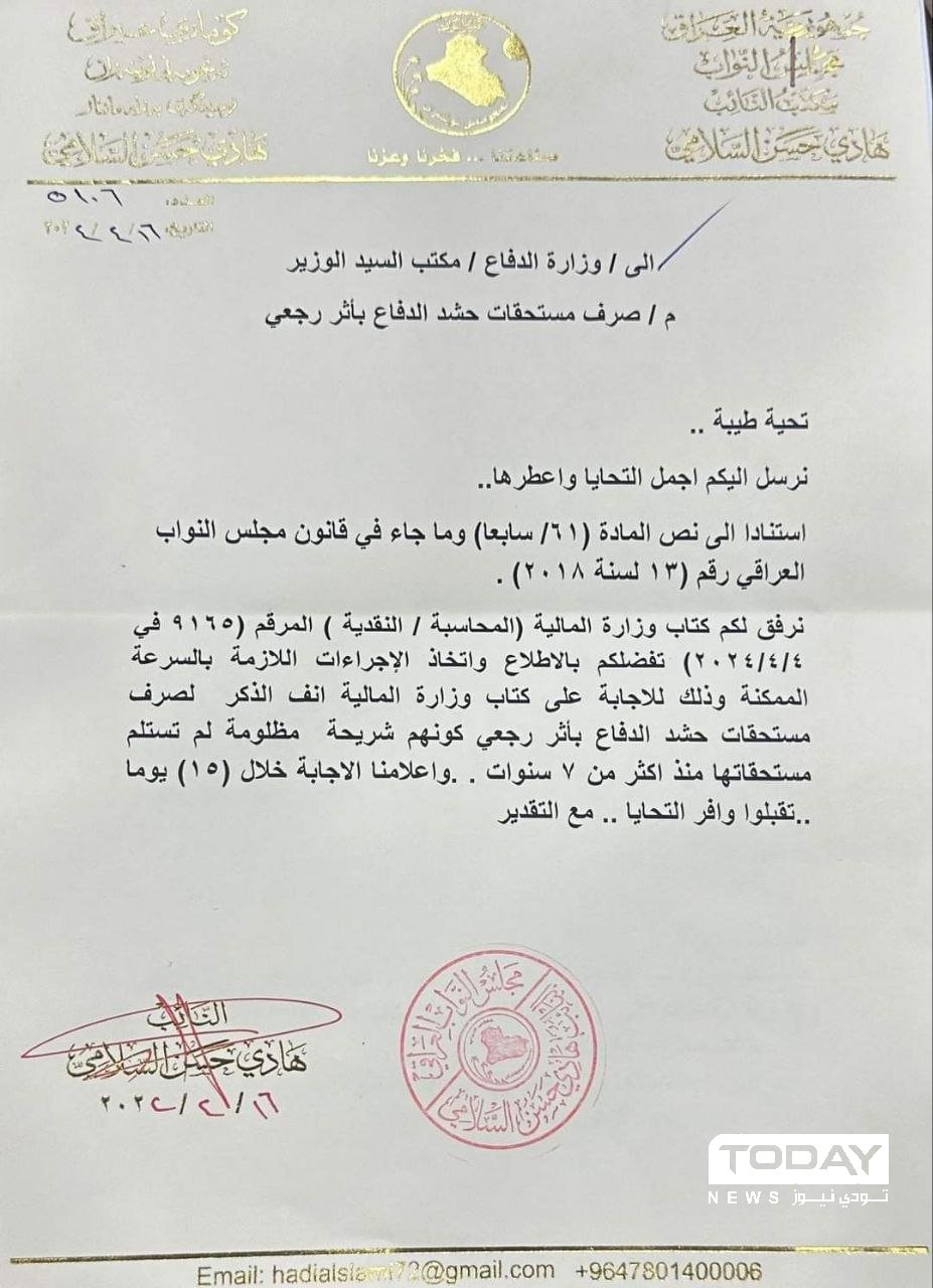 طلب نيابي لصرف مستحقات حشد الدفاع بأثر رجعي