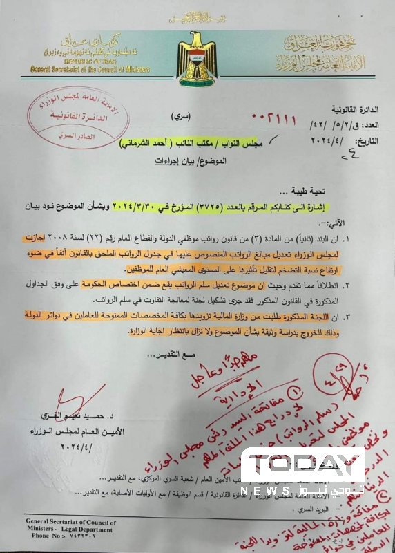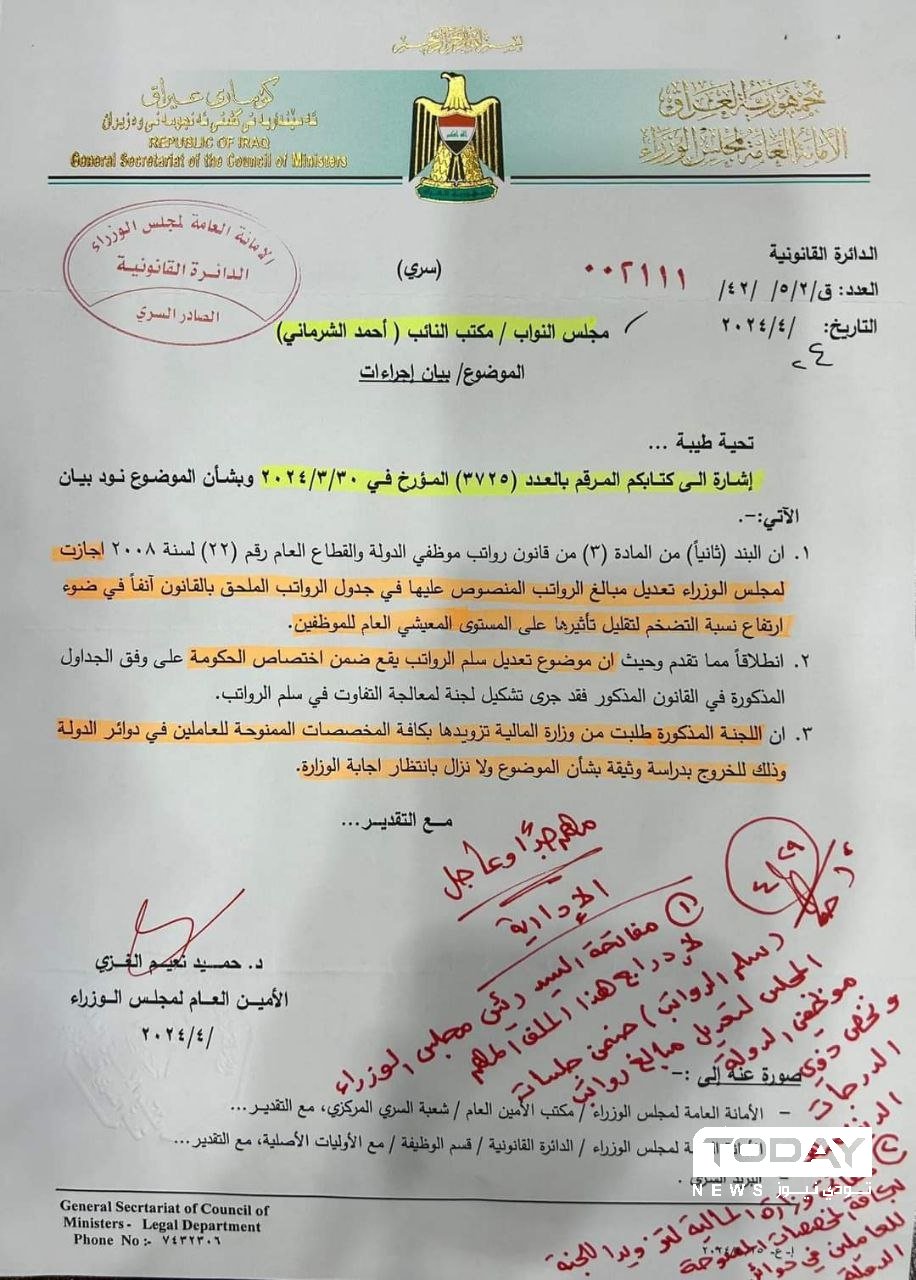 أعلنت الأمانة العامة لمجلس الوزراء، اليوم الثلاثاء، عن مفاتحتها رئيس مجلس الوزراء، محمد شياع السوداني، بشأن إدراج ملف "سلم الرواتب" في جدول أعمال مجلس الوزراء لتعديل رواتب موظفي الدولة.