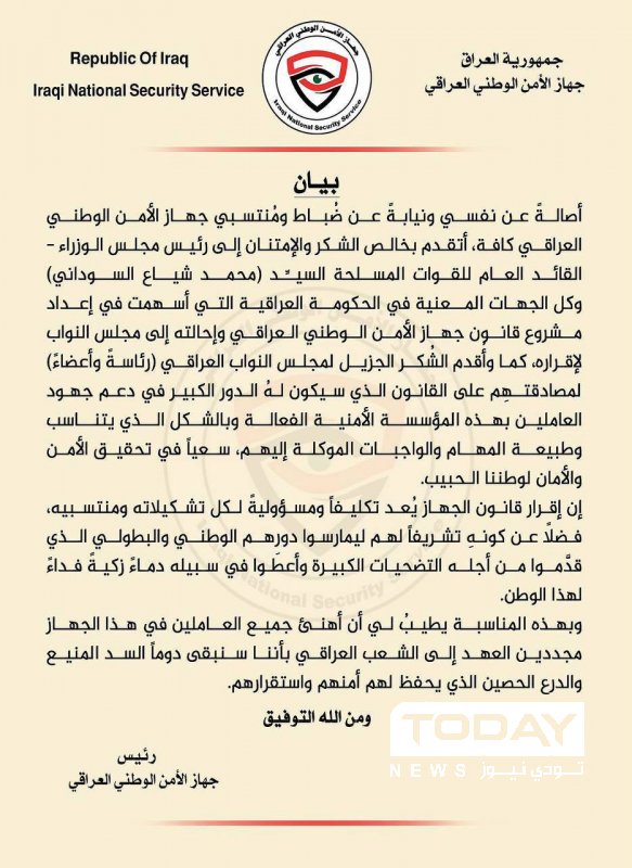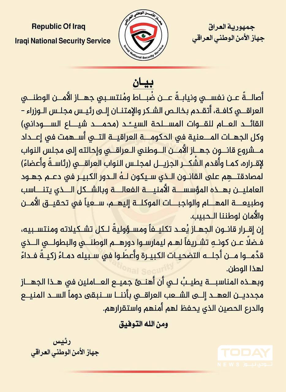 جهاز الامن الوطني يصدر بيانا بعد تصويت البرلمان على قانونه