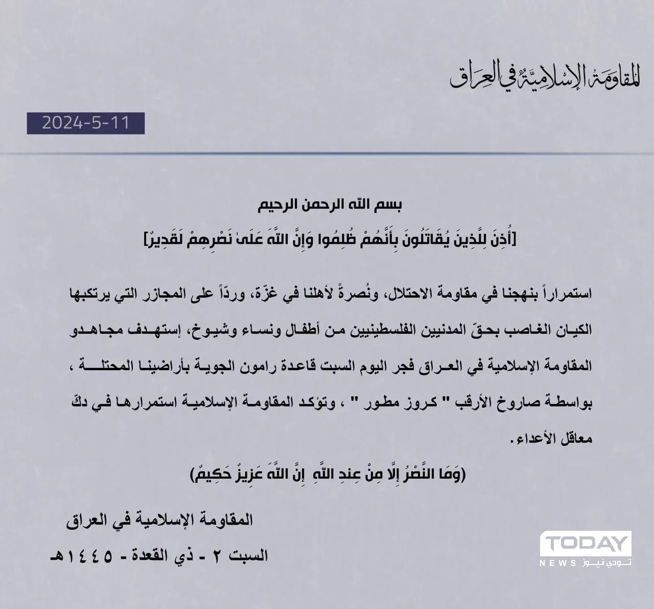 فصائل عراقية تتبنى قصف قاعدة رامون الجوية في فلسطين المحتلة