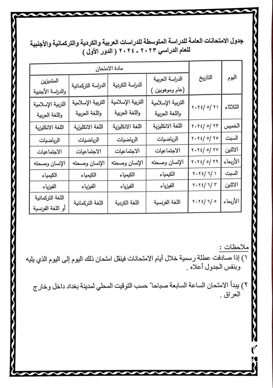 التربية تُعيد نشر جدول امتحانات الثالث المتوسط التي تنطلق يوم غد الثلاثاء
