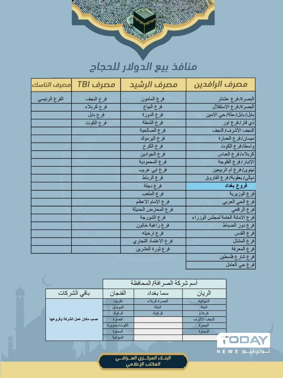 أعلن البنك المركزي العراقي، اليوم الأربعاء، عن منافذ بيع الدولار للحجاج.