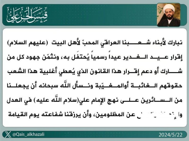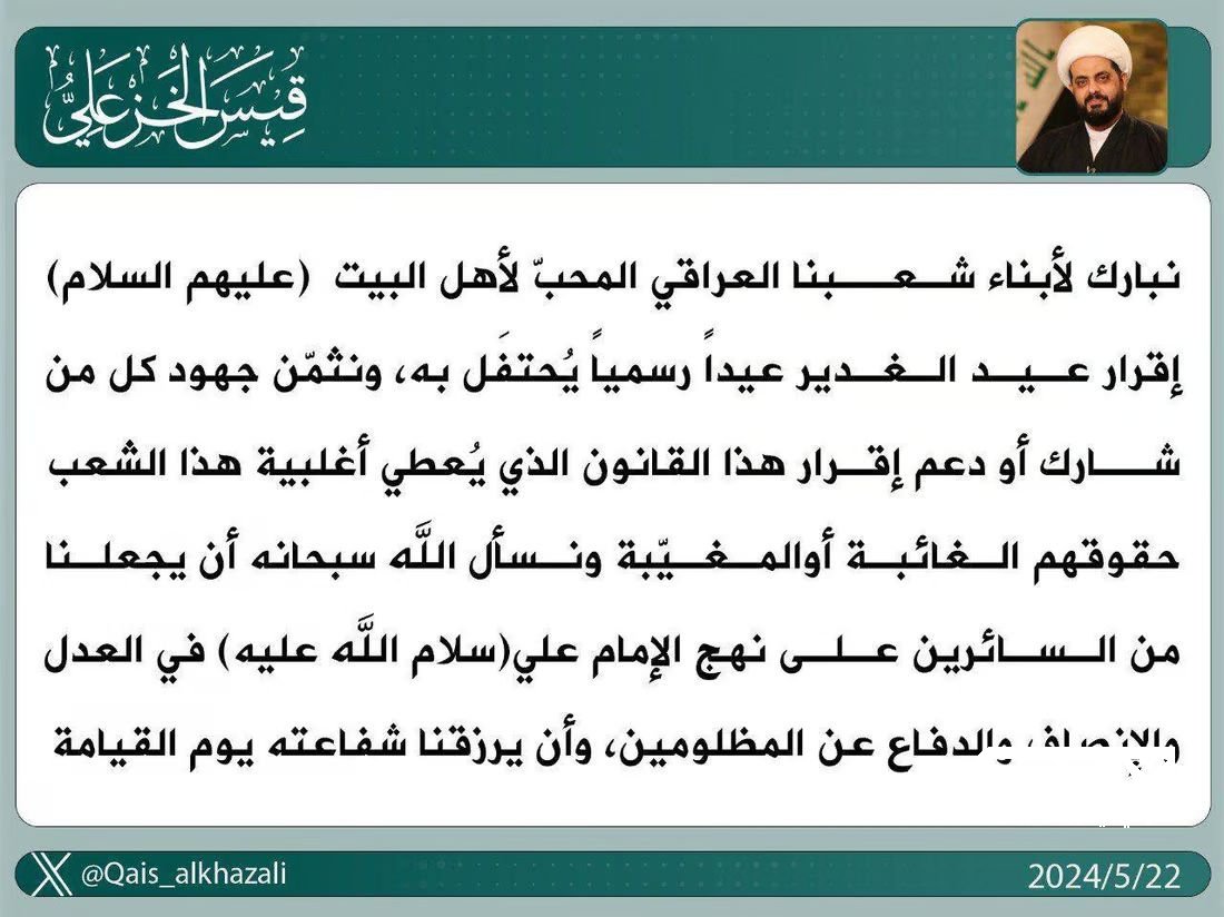 علق امين عام عصائب اهل الحق قيس الخزعلي ،اليوم الاربعاء، على اقرار قانون عيد الغدير عطلة رسمية، مبينا انه انصف اغلبية الشعب.