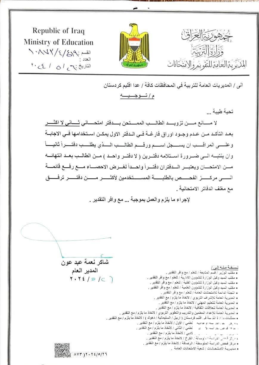 وثيقة : التربية تسمح بتزويد الطالب الممتحن بدفتر امتحاني آخر