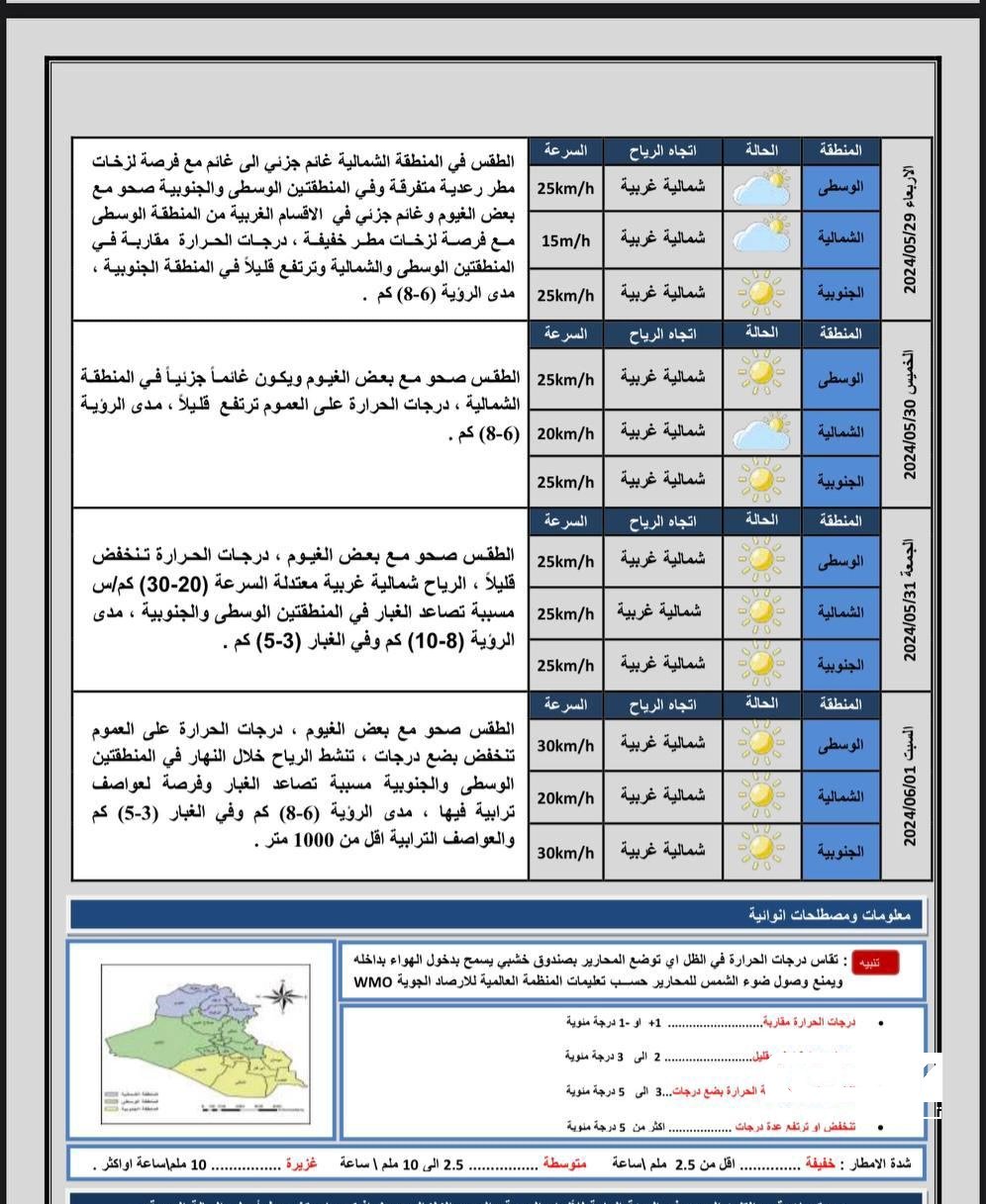 ولفت إلى أن "الحالة الجوية ليوم السبت المقبل، سيكون الطقس صحواً مع بعض الغيوم ، ودرجات الحرارة تنخفض بضع درجات في عموم البلاد"