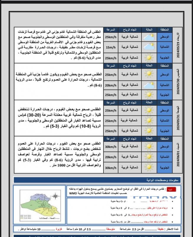 وذكر بيان للهيئة أن "الطقس ليوم غد الأربعاء في المنطقتين الوسطى والجنوبية سيكون صحواً مع بعض الغيوم وغائماً جزئياً في الأقسام الغربية من المنطقة الوسطى مع فرصة لزخات مطر خفيفة، فيما سيكون الطقس في المنطقة الشمالية غائماً جزئياً إلى غائم مع فرصة لزخات مطر متفرقة ، أما درجات الحرارة فستكون مقاربة في الأقسام الوسطى والشمالية، وترتفع قليلاً في القسم الجنوبي من البلاد".وأضاف البيان أن "طقس يوم الخميس، سيكون صحواً مع بعض الغيوم، ويكون غائماً جزئياً في المنطقة الشمالية، ودرجات الحرارة ترتفع قليلاً في عموم البلاد".