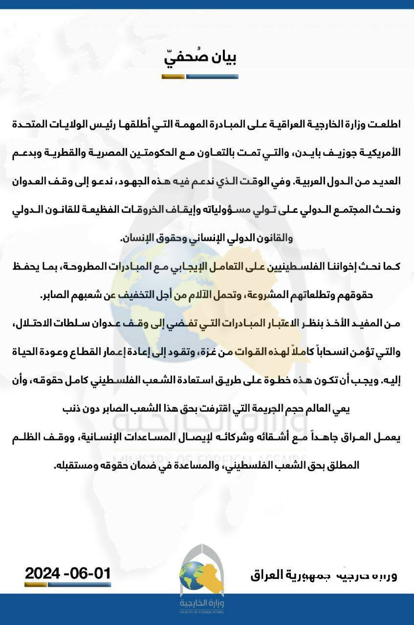 رحبت وزارة الخارجية العراقية، بميادرة الرئيس الأمريكي جو بايدن بشأن قطاع غزة.