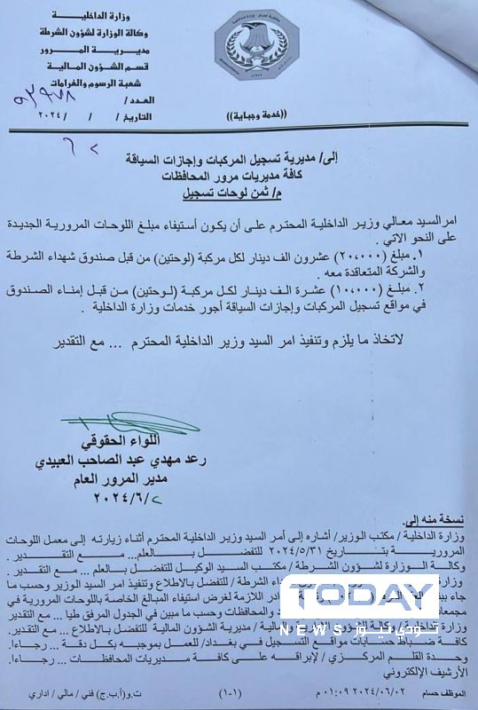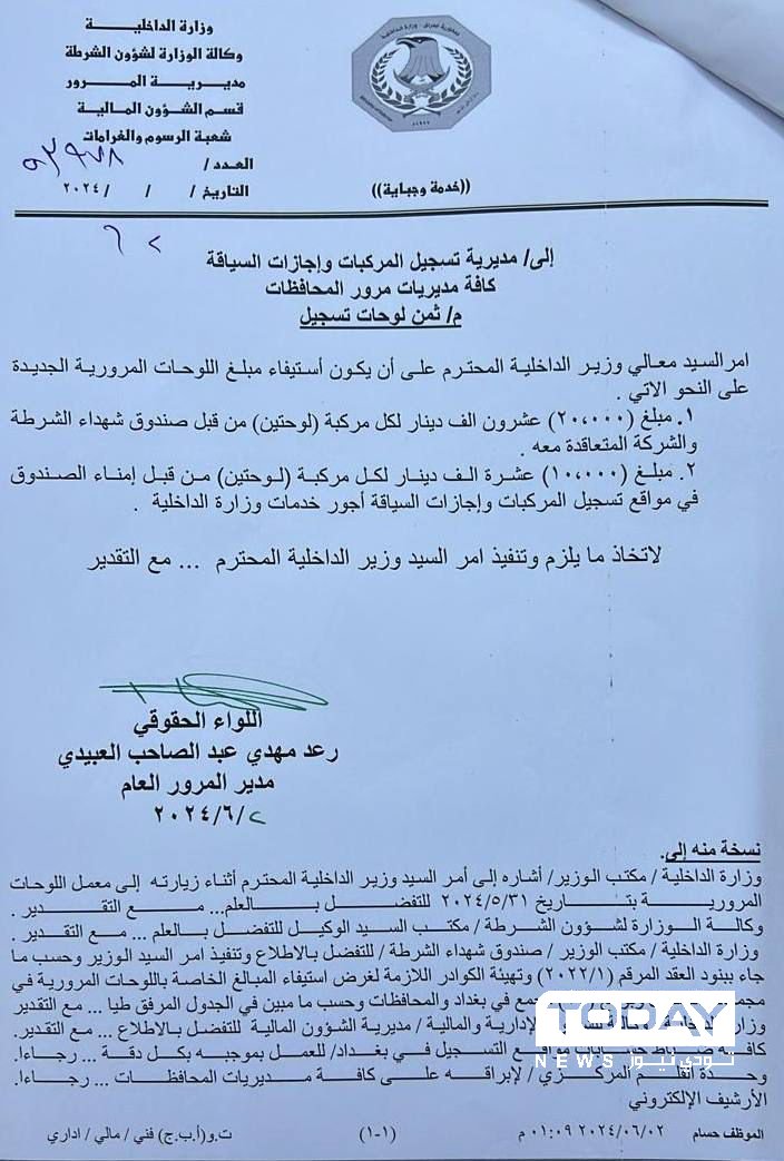 وأظهرت وثيقة صادرة عن الوزارة بتوقيع مدير المرور العامة ، إن وزيرها عبد الأمير الشمري أمر أن يكون استيفاء مبلغ اللوحات الحكومية الجديدة لكل مركبة 20 الف دينار من قبل صندوق شهداء الشرطة، و10 الاف دينار من قبل امناء الصندوق في مواقع التسجيل.