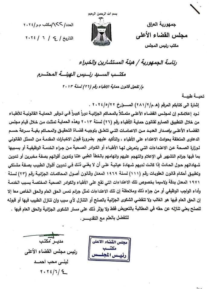 القضاء الأعلى يستجيب بشأن تفعيل قانون حماية الأطباء