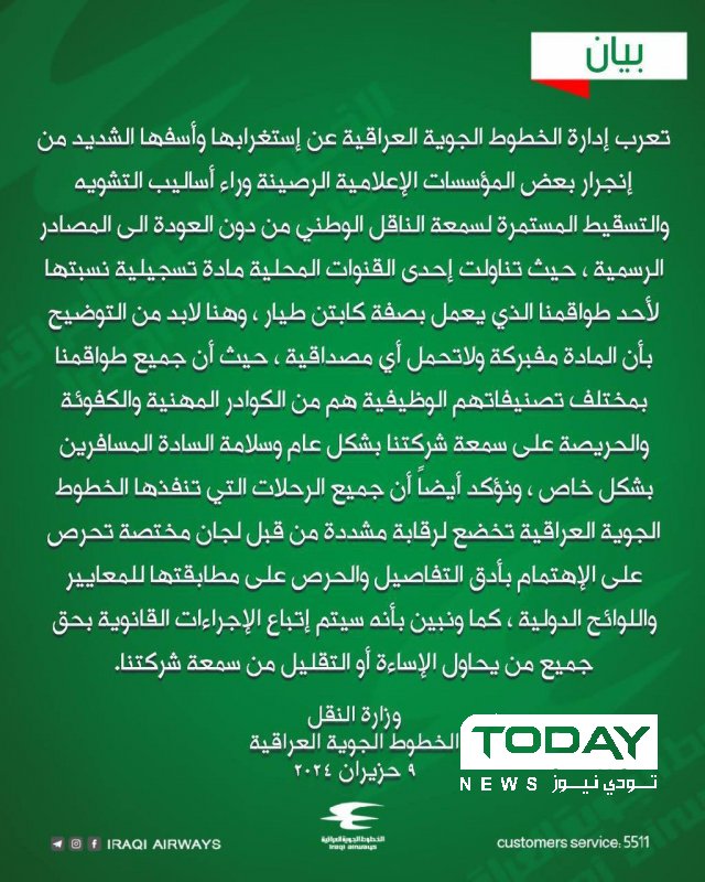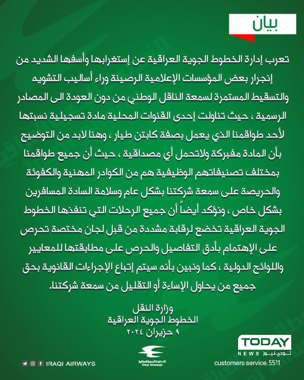 أصدرت الخطوط الجوية العراقية، اليوم الأحد، بياناً بشأن التسريبات الصوتية المنسوبة لأحد كباتن "الطائر الأخضر"، لافتة إلى أن جميع الرحلات تخضع لرقابة مشددة، وحرص كبير على مطابقة المعايير واللوائح الدولية.
